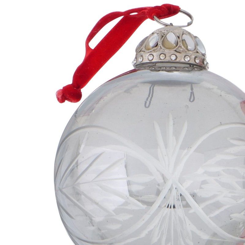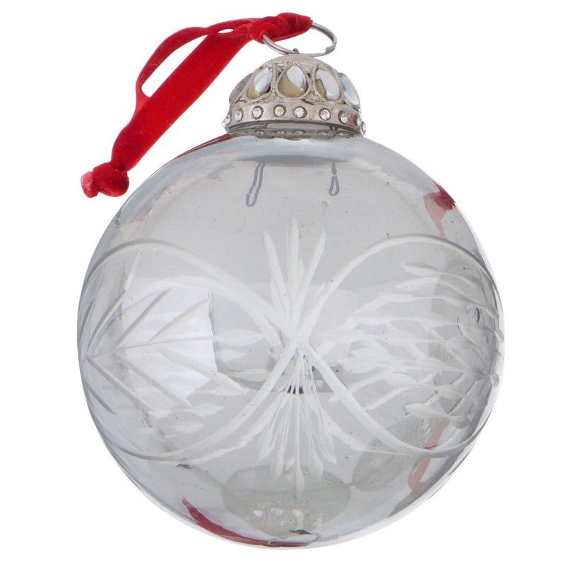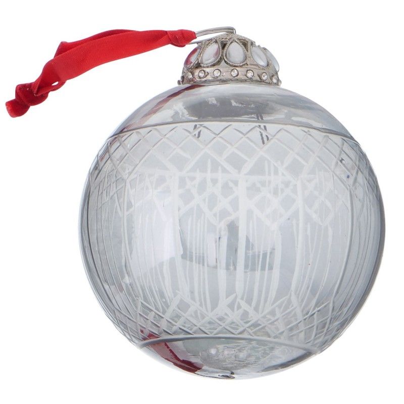 Bola de navidad fabricada en vidrio de 10cm de diámetro con detalle de lazo rojo. Decorar el árbol de Navidad es algo que nos encanta a pequeños y grandes. Disfruta de ese momento decorándolo con las bolas más bonitas. Cuatro modelos a elegir o para combinar.