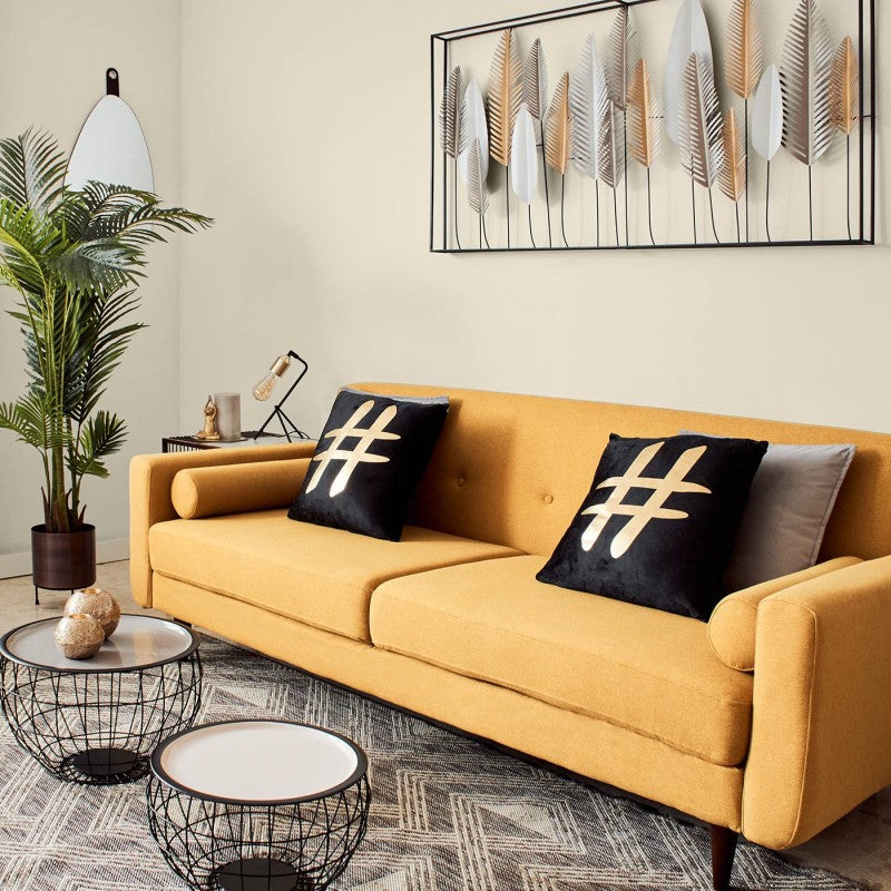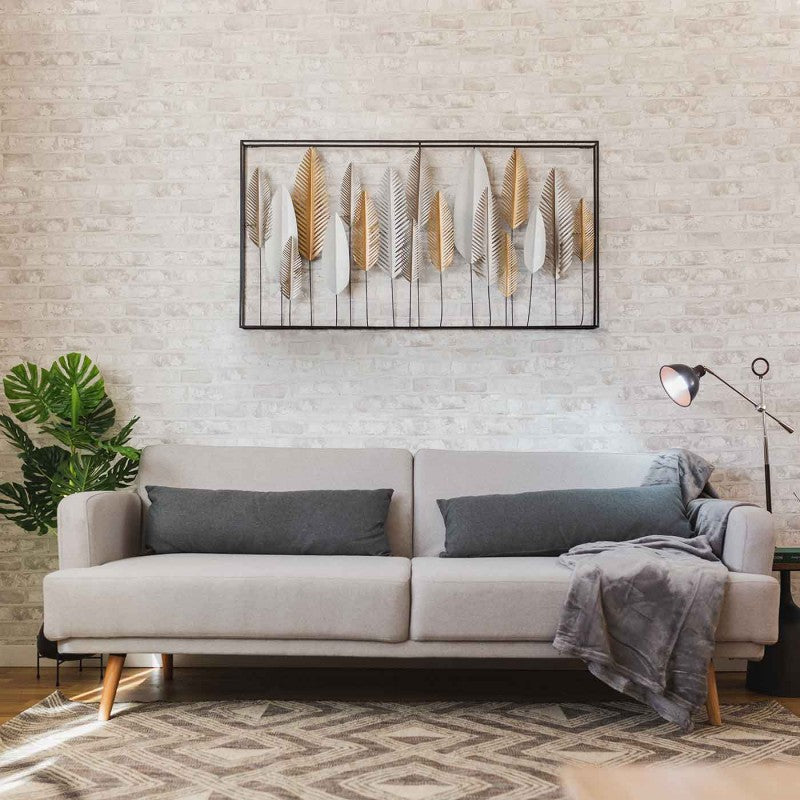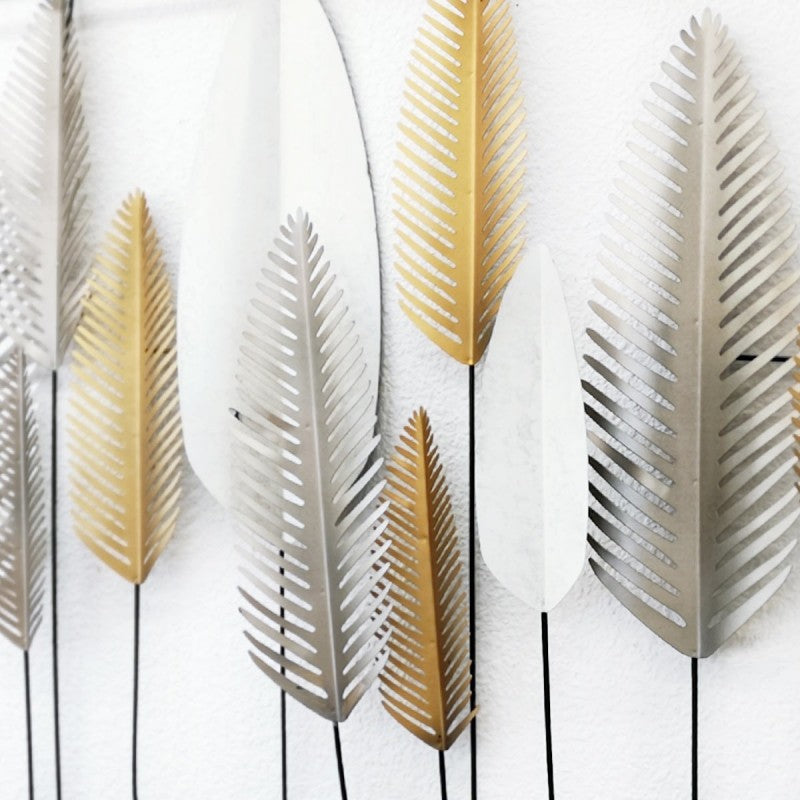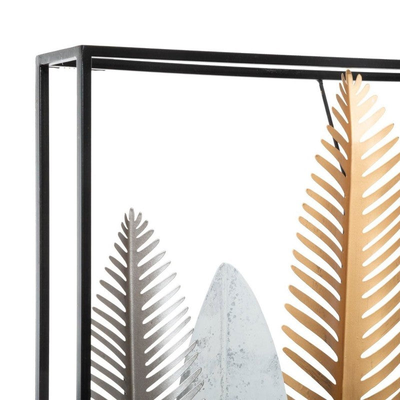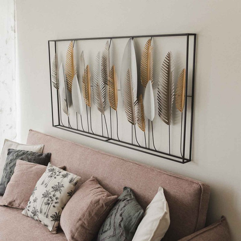 Panel fabricado en metal de 134x68cm con hojas en color plata, dorado y blancas. Un gran panel metálico para vestir tus paredes. ¡Será el centro de todas las miradas!